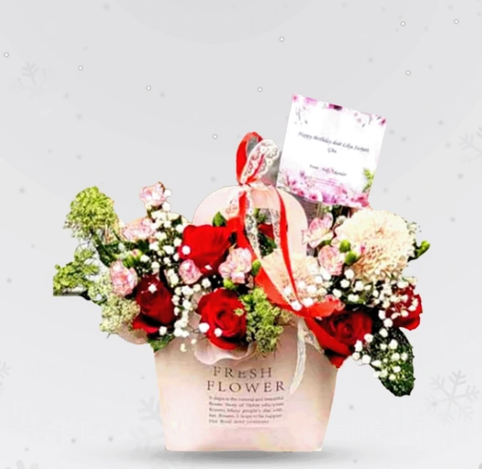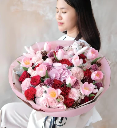 "Rangkaian bunga mix warna pastel pink yang lembut dan feminin, perpaduan sempurna antara mawar, krisan, dan bunga musiman pilihan."