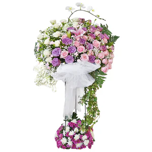 Rangkaian bunga berdiri yang mewah untuk peresmian atau ucapan selamat. Kombinasi warna ungu dan putih memberikan kesan elegan dan profesional.e