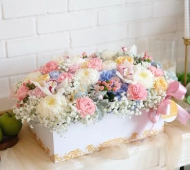 Perpaduan berbagai bunga putih dan biru pastel yang menenangkan. Pilihan tepat untuk ucapan "Get Well Soon" atau hiasan acara syukuran.