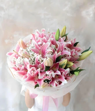 "Buket bunga lily pink yang menawan dengan aroma harum alami, pilihan tepat untuk mengungkapkan rasa sayang dan perhatian."