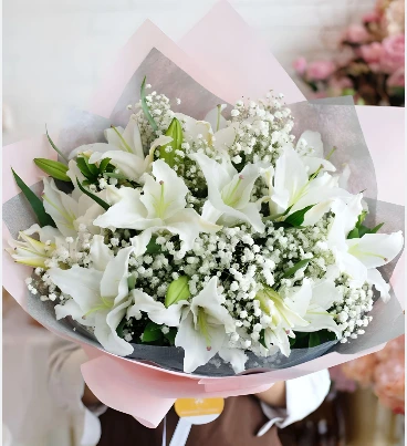 "Rangkaian bunga lily putih yang anggun dan segar, melambangkan kemurnian dan ketulusan hati."