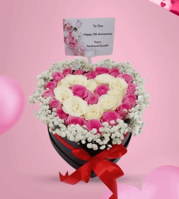 Rangkaian mawar pink dan putih yang dibentuk hati secara presisi. Ekspresi kasih sayang yang paling romantis.