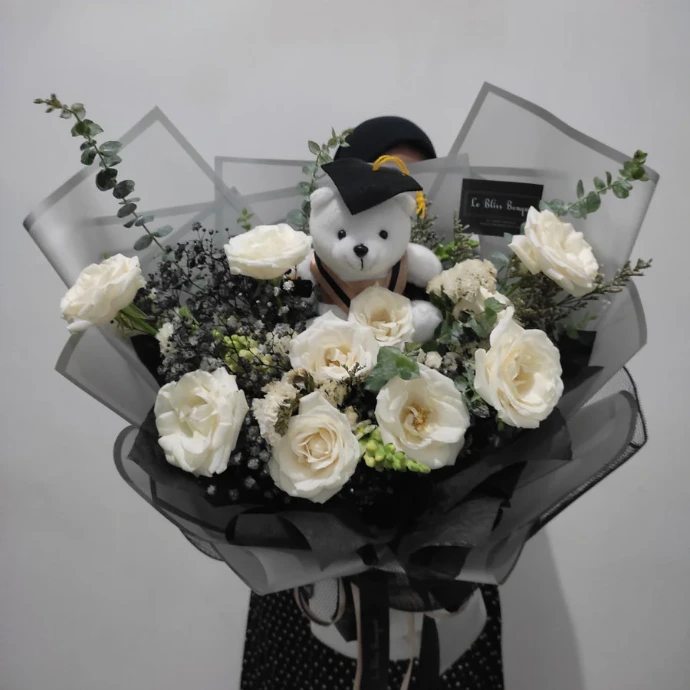 "Buket mawar putih eksklusif yang dipadukan dengan boneka teddy bear lucu, hadiah sempurna untuk wisuda, maupun perayaan istimewa."