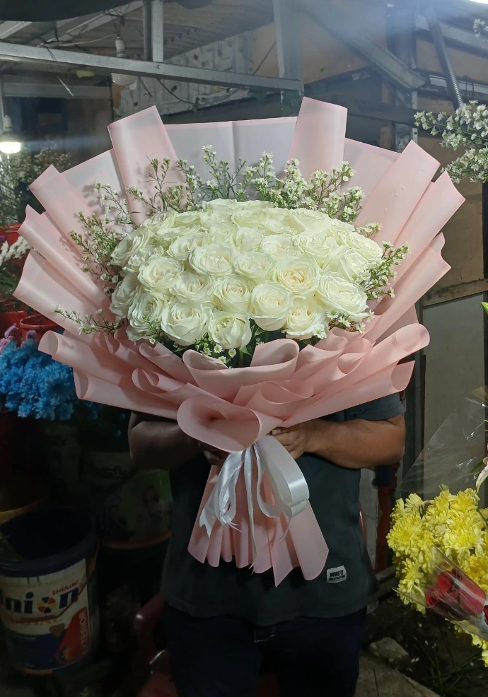 "Buket mawar putih premium dalam balutan wrapping pink elegan, simbol ketulusan dan keanggunan yang cocok untuk berbagai kesempatan."