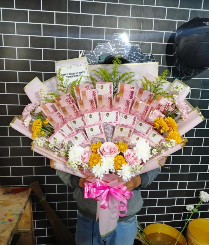 "Rangkaian kreatif yang menggabungkan bunga segar dengan uang tunai, hadiah unik dan berkesan untuk berbagai momen perayaan."