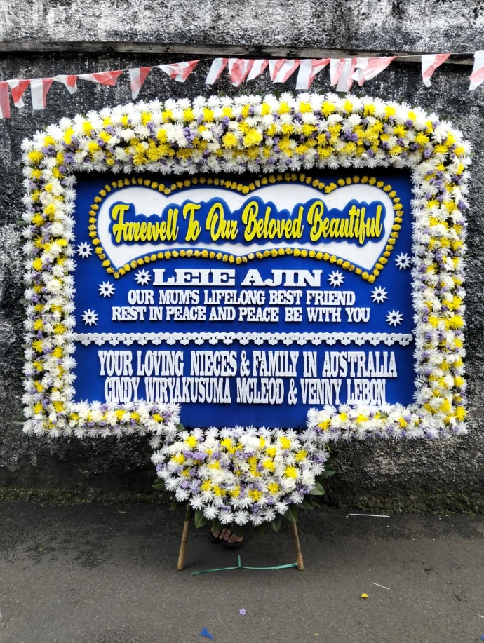 Ungkapan duka cita yang tulus dalam bentuk rangkaian bunga melingkar yang khidmat. Menggunakan bunga krisan dan lili segar pilihan.