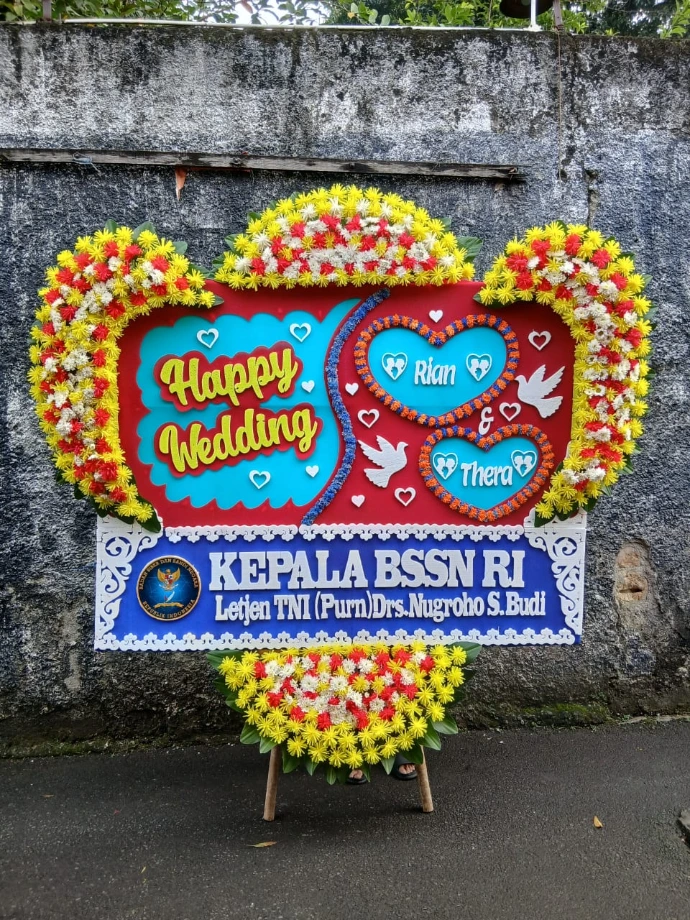 "Papan bunga selamat pernikahan dengan desain hati berwarna cerah, hadir sebagai bentuk doa dan ucapan bahagia untuk pasangan yang baru menikah."